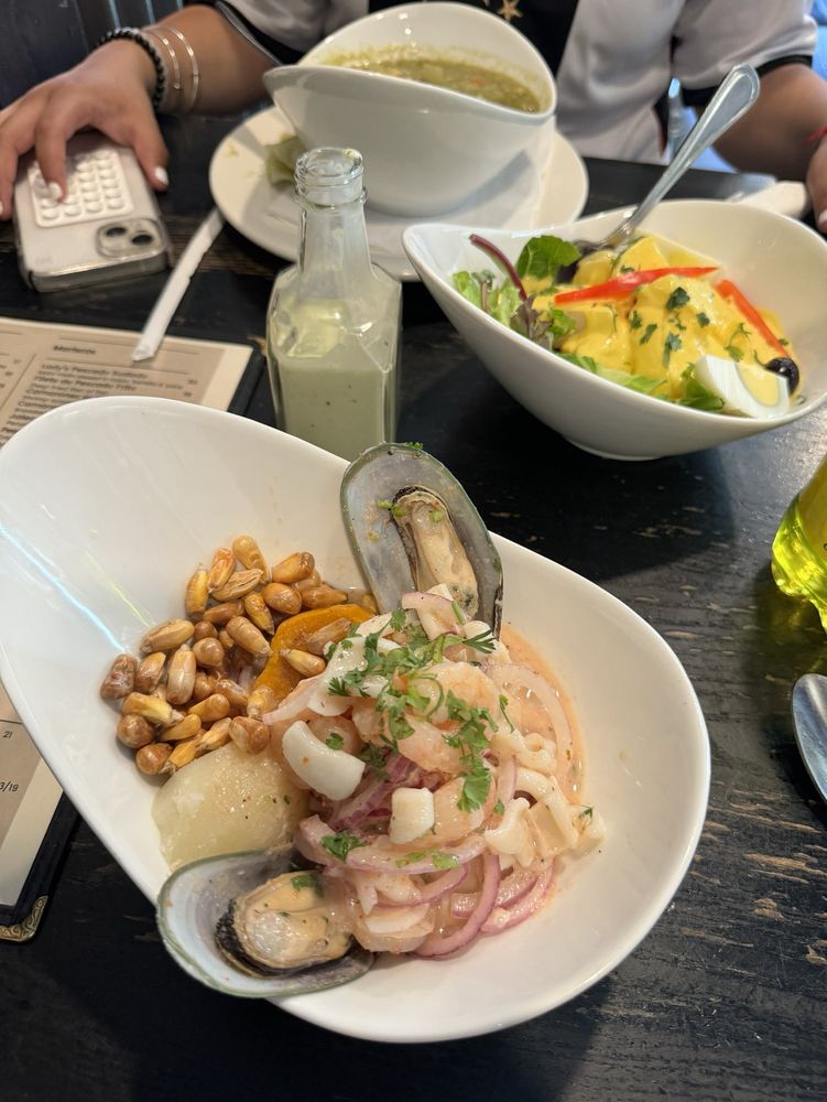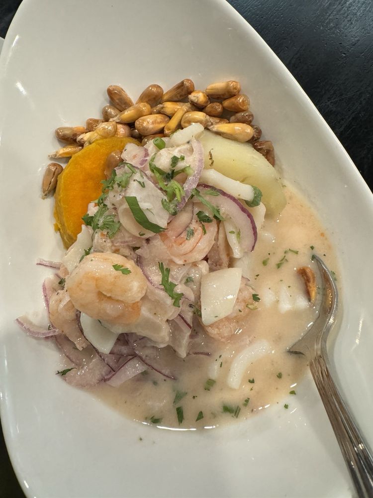 Braised lamb in a cilantro and aji panca, served with yuca, rice, beans, and salsa.